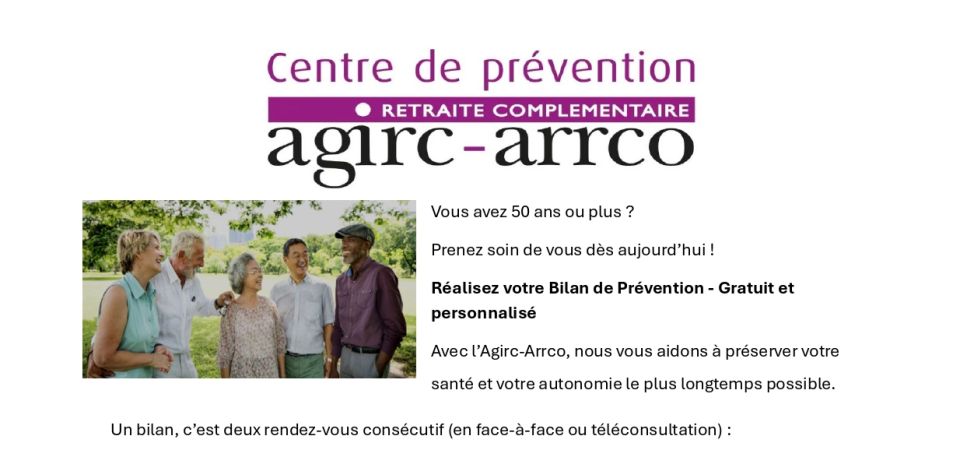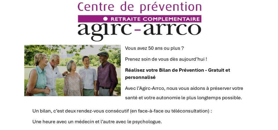 Dans le cadre de ses actions de prévention et du bien vieillir, l’Agirc-Arrco propose aux personnes de 50 ans et plus un bilan de prévention complet d'une durée de 2 heures, gratuit et personnalisé, en face-à-face, mais également à distance, par téléconsultation ou par téléphone dans quatre centres :