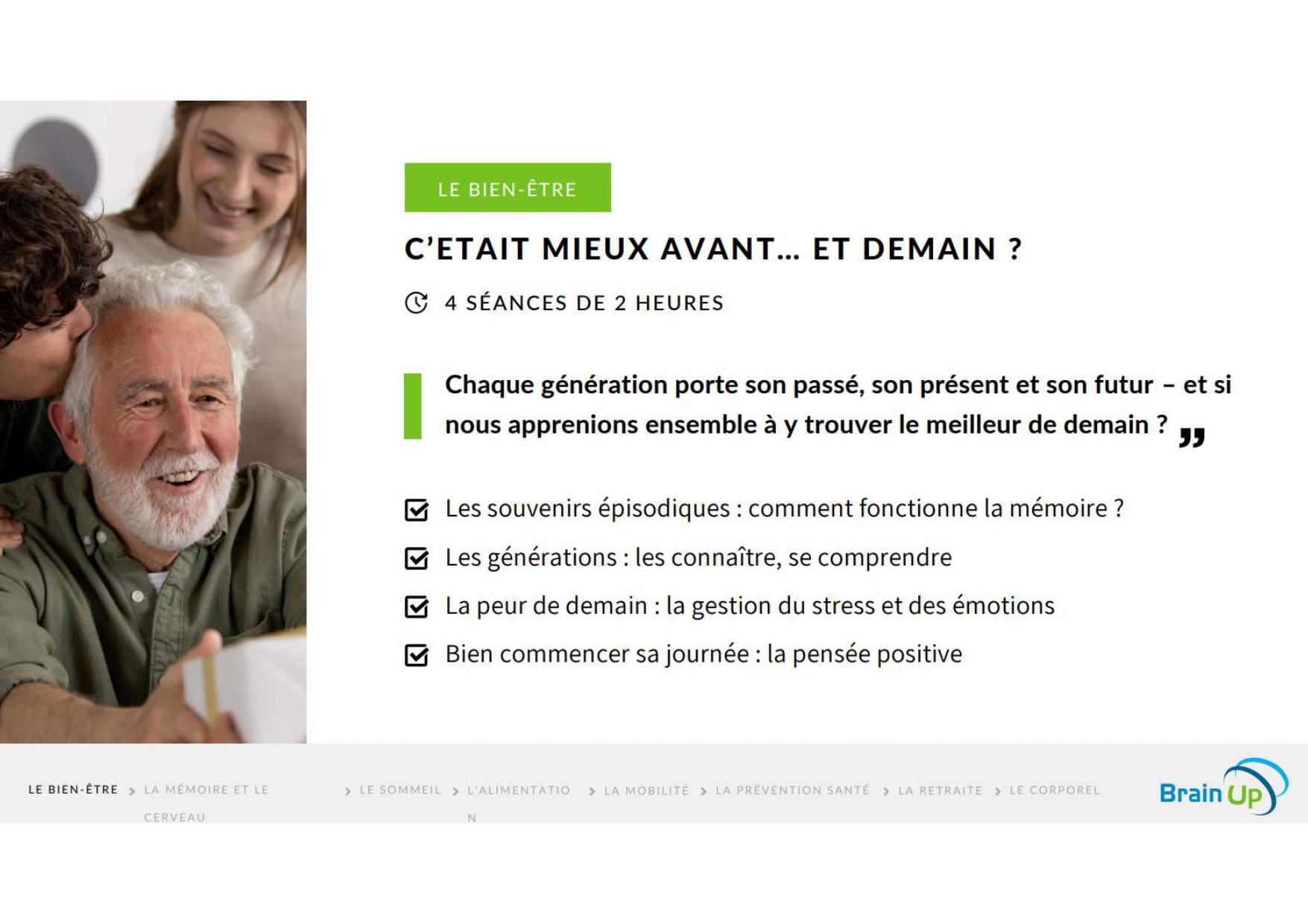 Thématiques abordées : mémoire, souvenirs, les générations, gestion du stress et des émotions, pensées positives