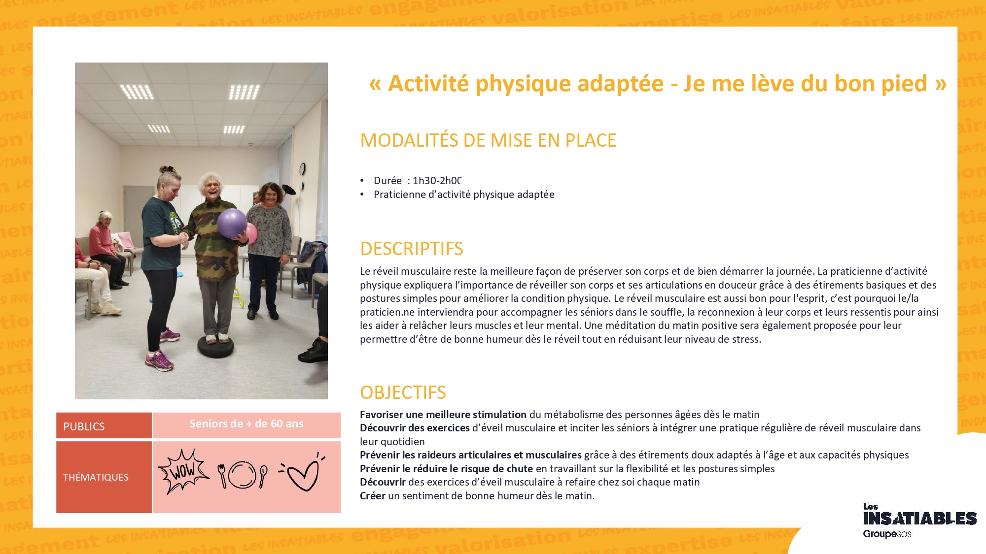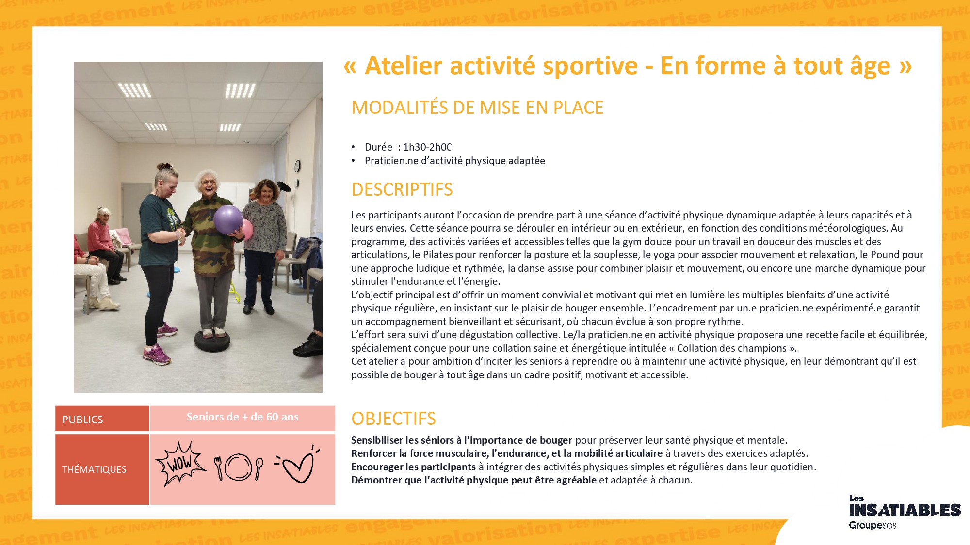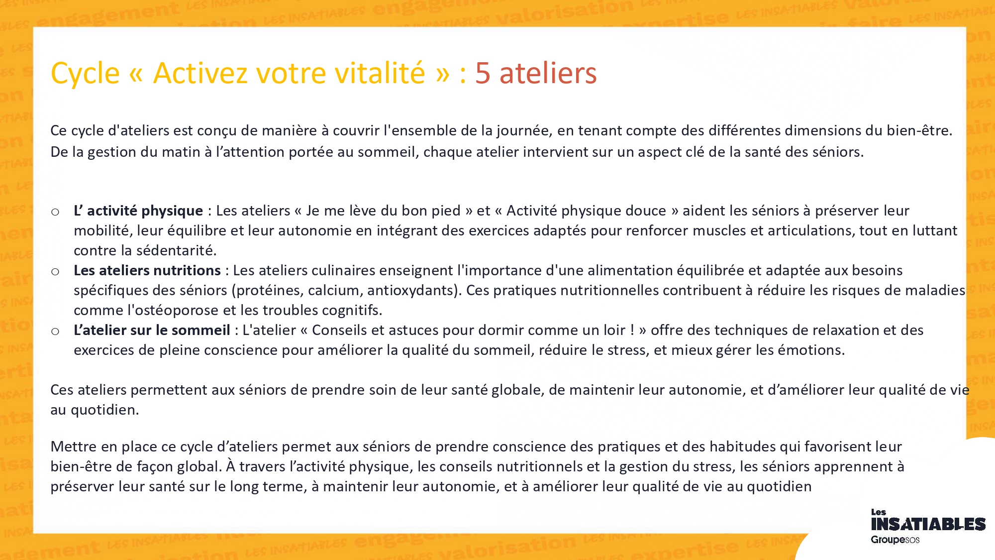 Atelier « Vitalité »Partenaire : Les InsatiablesFormat : 5 séances de 1h30 à 3h, périodicité modulable à définir (1 atelier/semaine, 2/semaine, 2/mois, 1/mois…)Période de déploiement : 1er semestre 2026Thématiques abordées : bien-être, mobilité, nutrition, sommeil