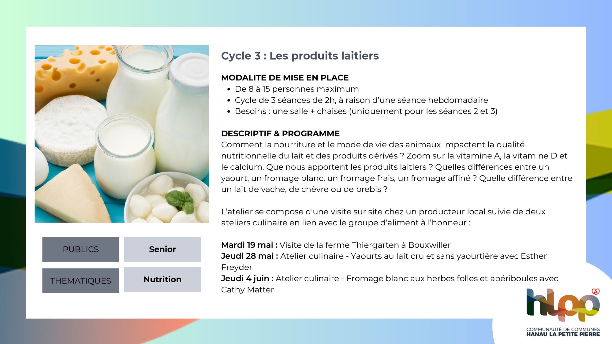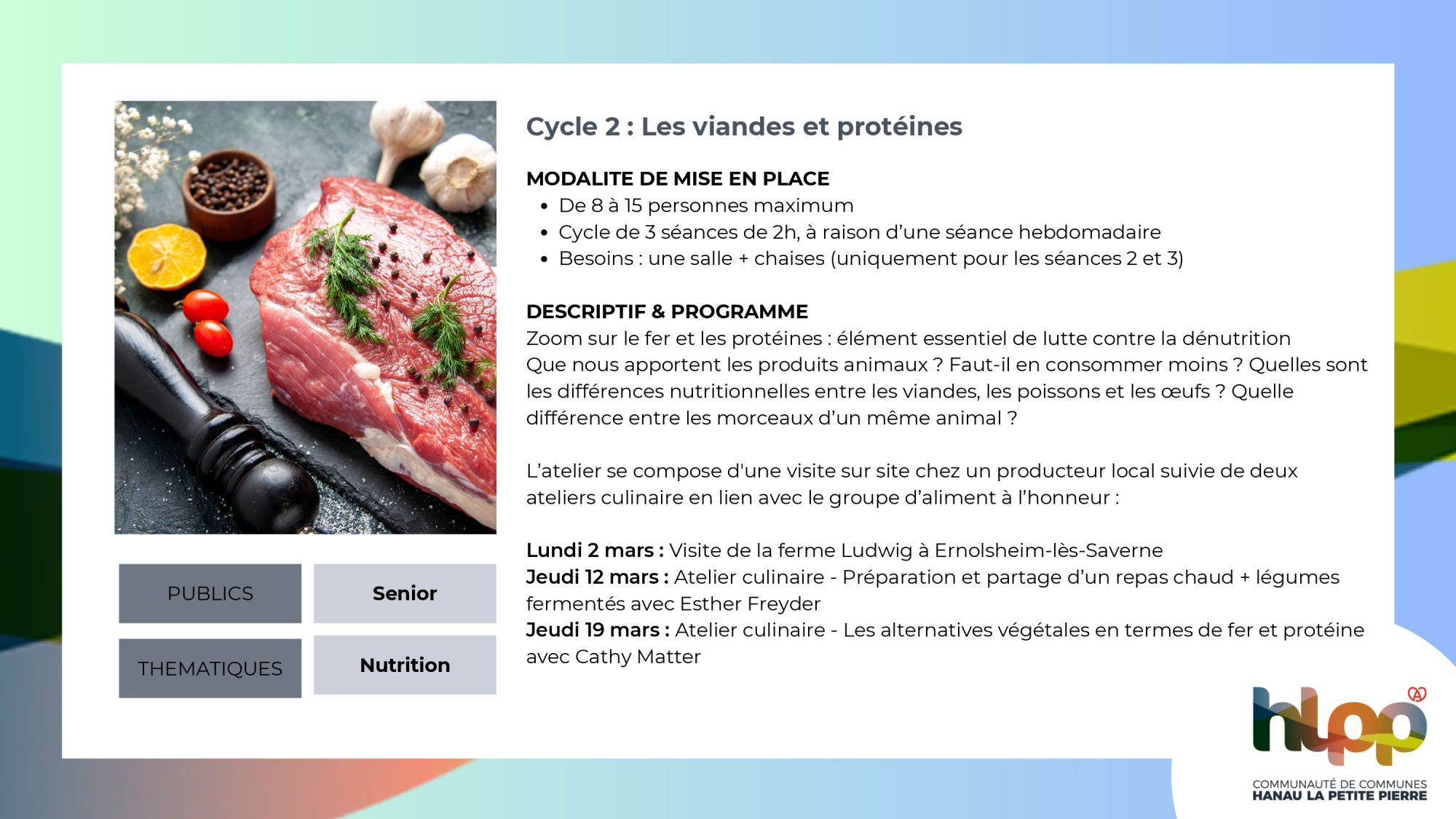 4. Atelier "nutrition santé & richesses locales" (projet porté par la CCHLPP)Intervenantes : Esther Freyder / Cathy Matter Format : 3 séances de 2h, à raison d'une séance hebdomadaire (3 cycles au choix)Période de déploiement : Février, Mars ou Mai 2026Thématiques abordées : équilibre alimentaire, plaisir, circuits courts & consommation locale, convivialité