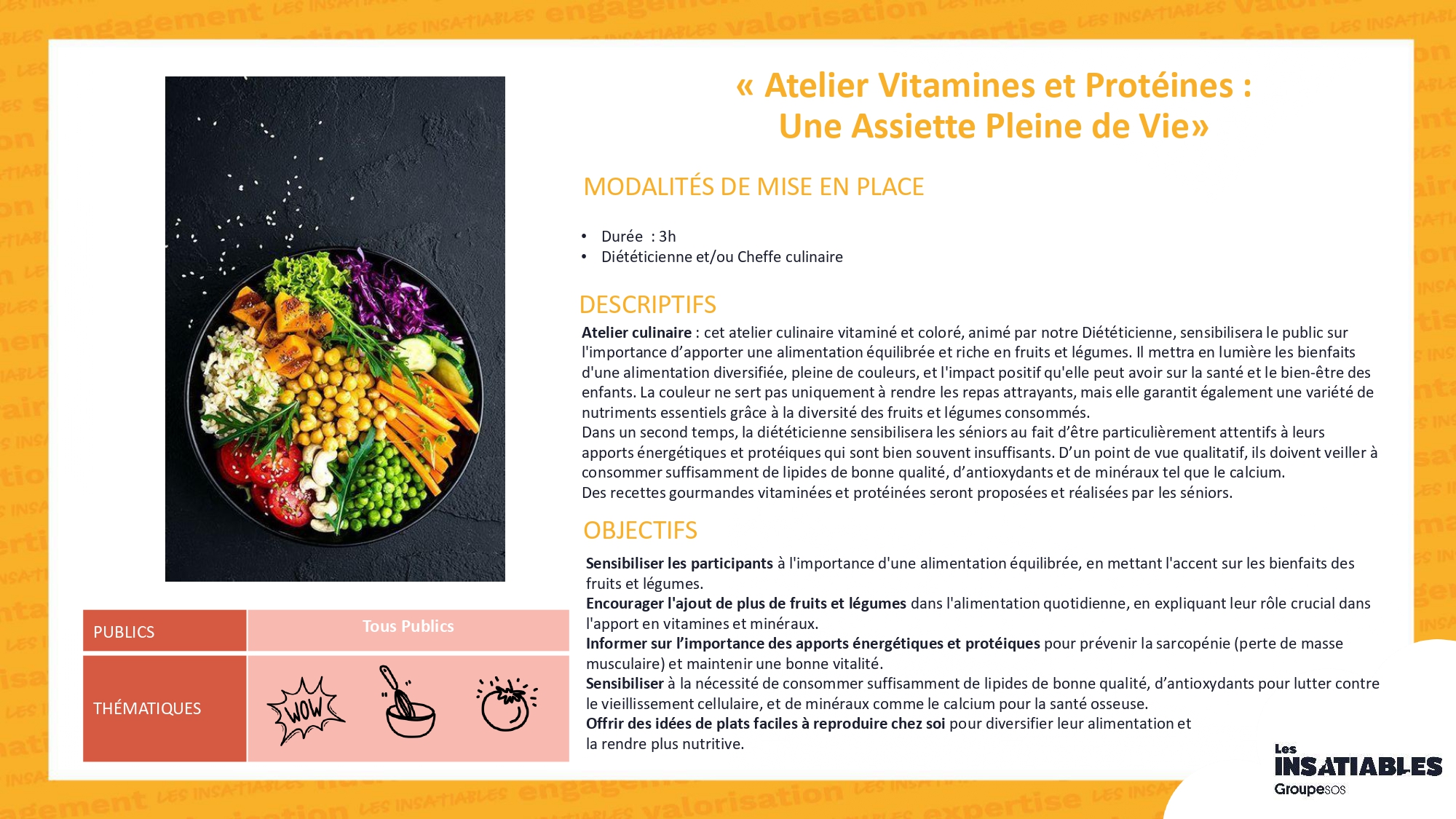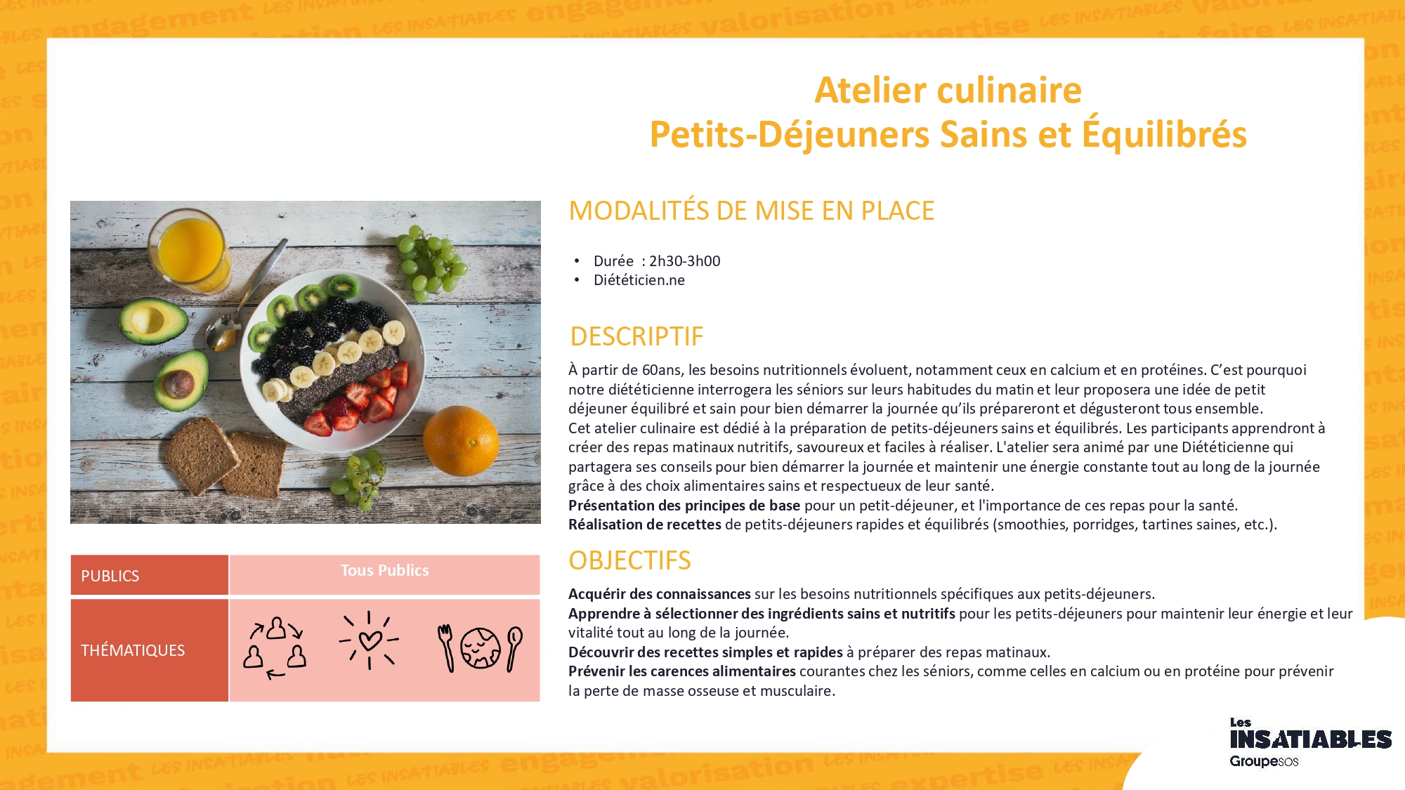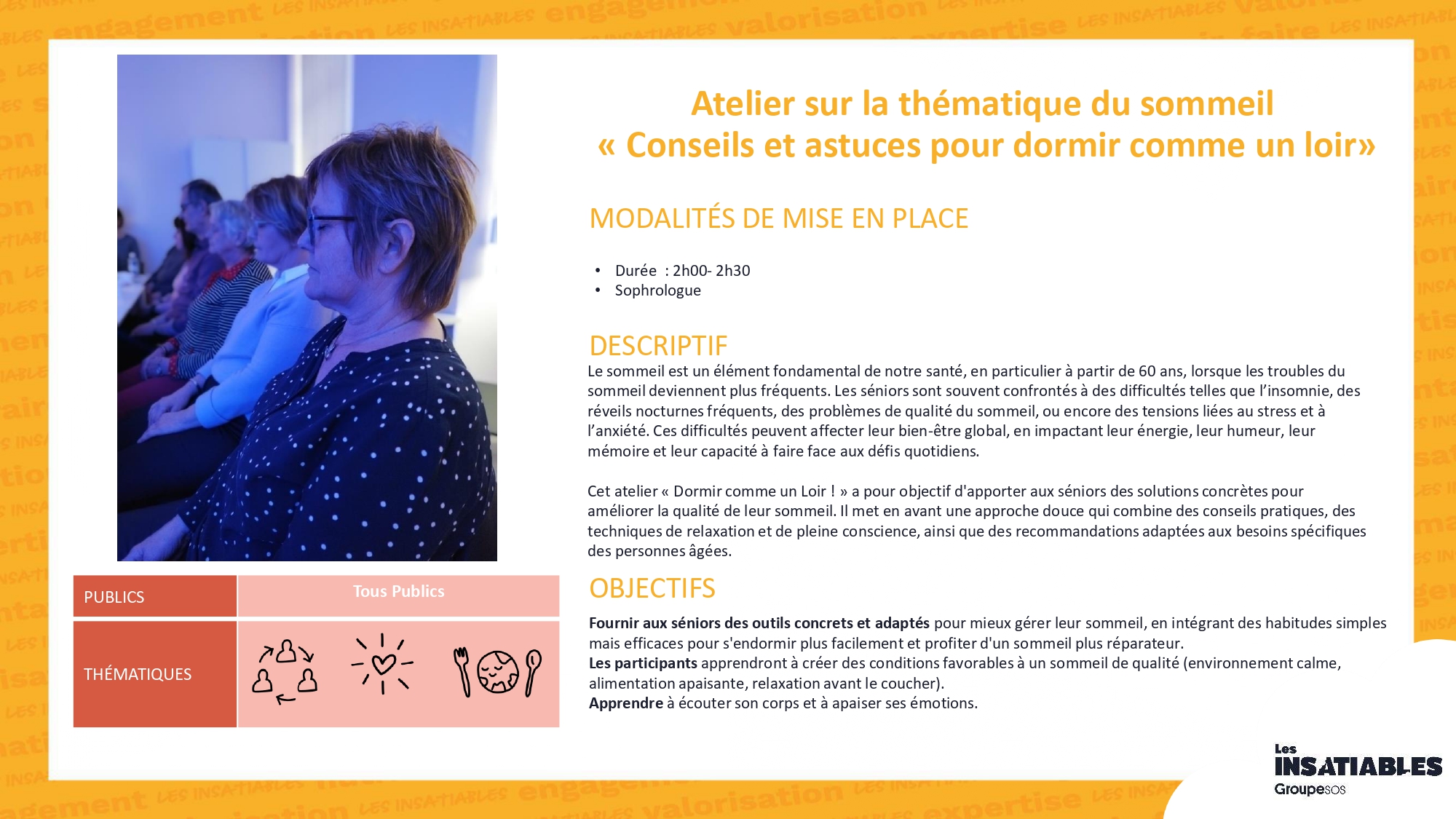 Atelier « Vitalité »Partenaire : Les InsatiablesFormat : 5 séances de 1h30 à 3h, périodicité modulable à définir (1 atelier/semaine, 2/semaine, 2/mois, 1/mois…)Période de déploiement : 1er semestre 2026Thématiques abordées : bien-être, mobilité, nutrition, sommeil