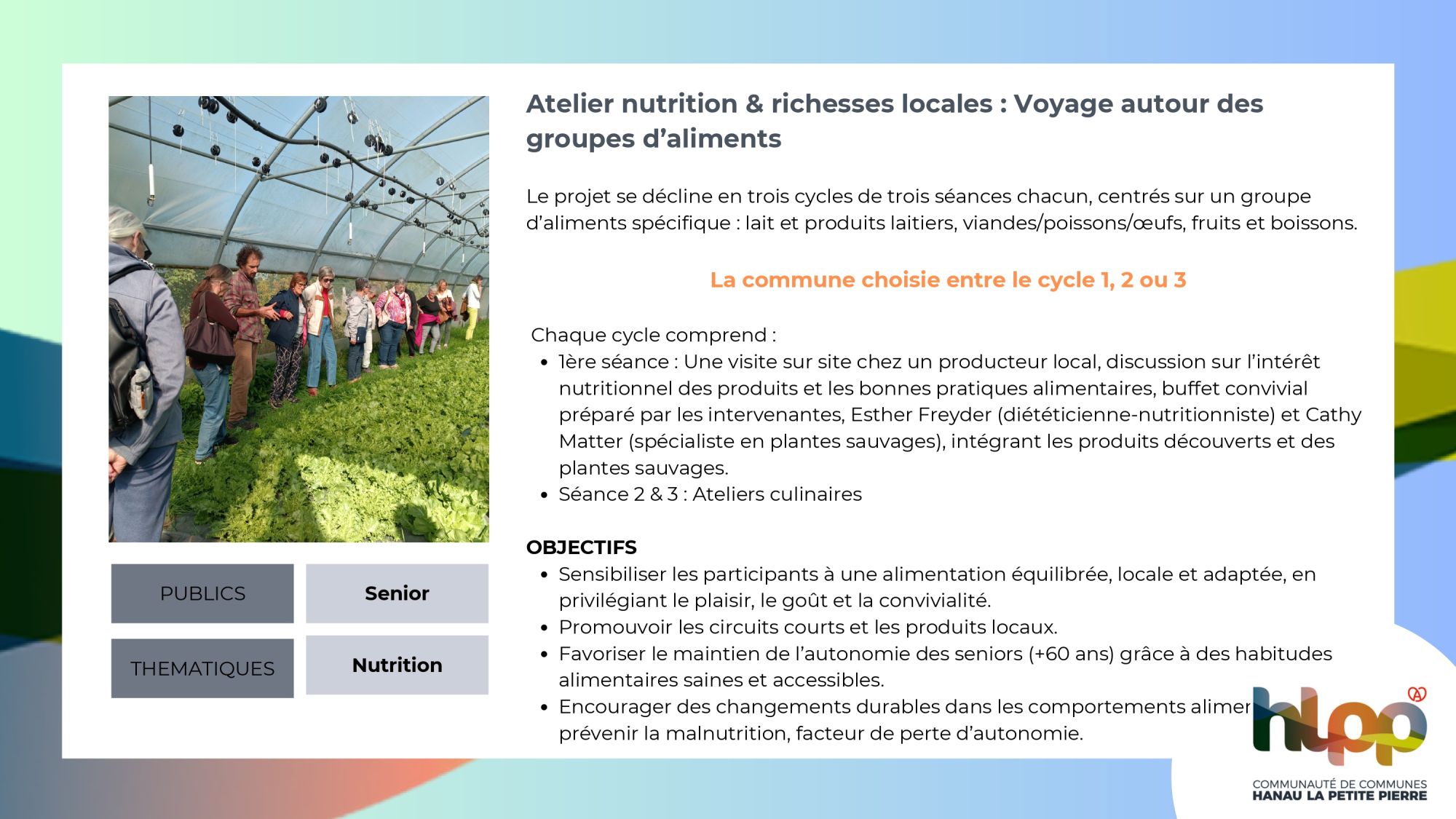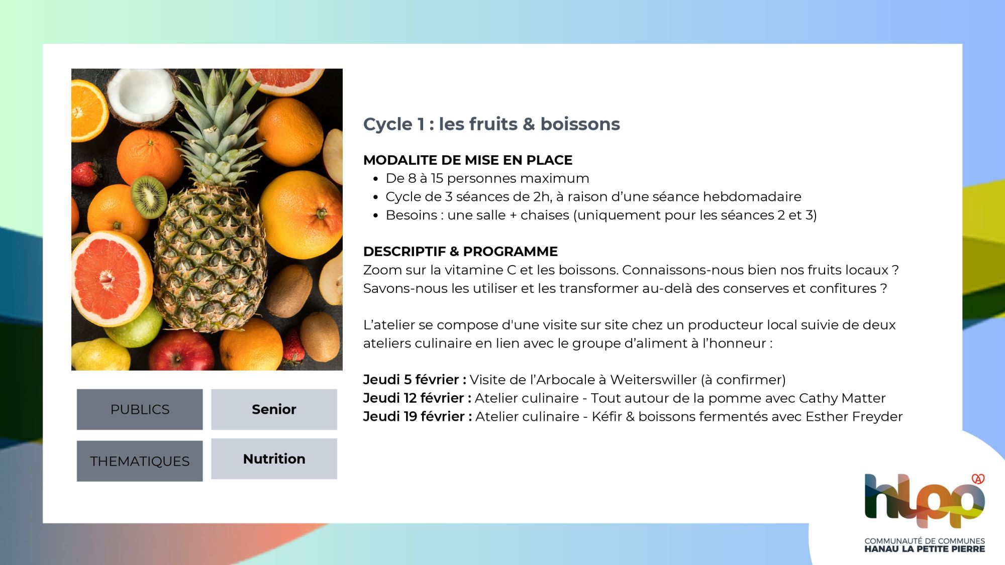 4. Atelier "nutrition santé & richesses locales" (projet porté par la CCHLPP)Intervenantes : Esther Freyder / Cathy Matter Format : 3 séances de 2h, à raison d'une séance hebdomadaire (3 cycles au choix)Période de déploiement : Février, Mars ou Mai 2026Thématiques abordées : équilibre alimentaire, plaisir, circuits courts & consommation locale, convivialité